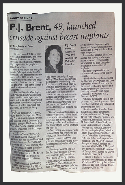 PJ’s husband, Ed Brent, testified at an FDA hearing. In his testimony he said his wife had committed suicide two months after testifying at a previous hearing on breast implants. She believed that silicone from her implants had seeped into her breast milk and sickened her two children. He said the children she had breastfed before the implants are healthy. “P. J. felt terrible guilt that her two daughters had been so seriously harmed by her decision to get breast implants.”